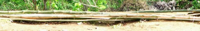 bamboo poles (pictured above) used as crosspieces over top, and the frame covered with either tarps or palm leaves (pictured at left). Those of us sitting near the crack between the edge of the shelter and the beginning of the church roof overhang had to move as best we could in order to stay in the shade as the sun moved overhead.